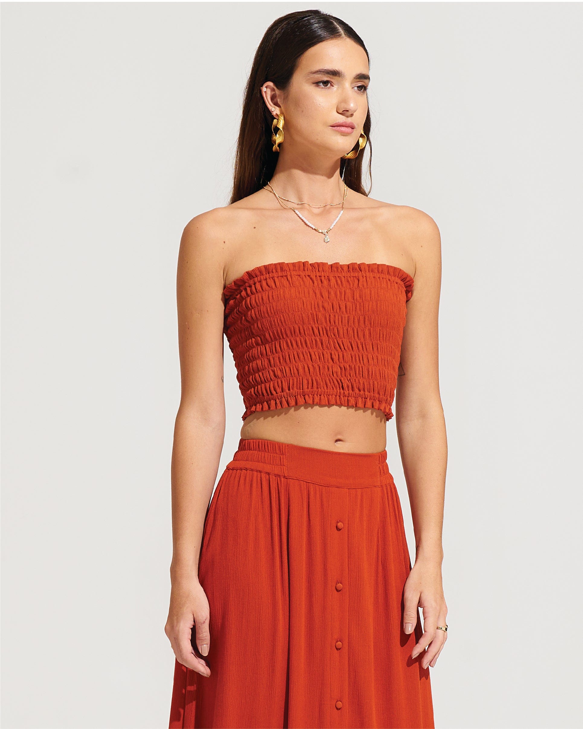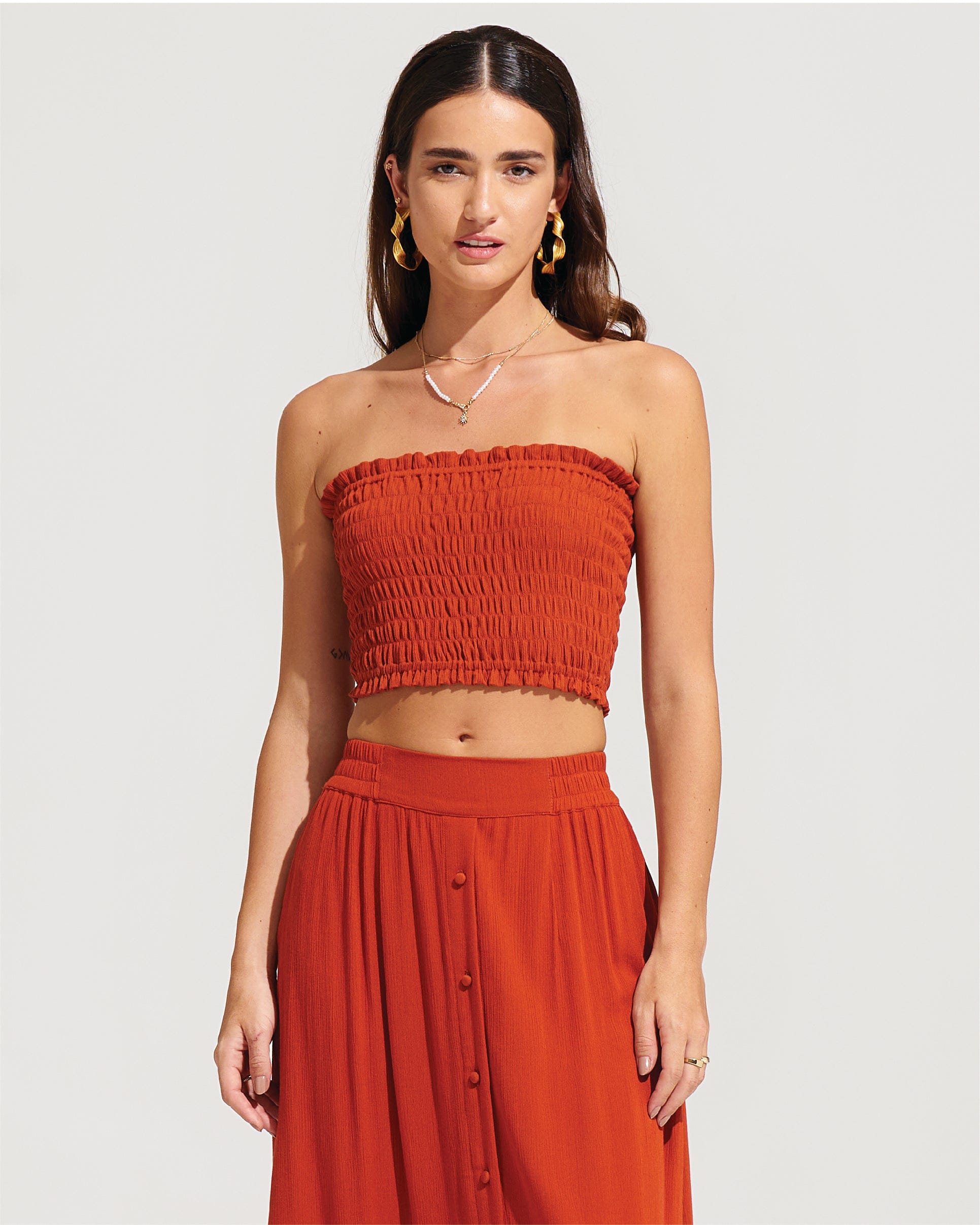 This Sonth Bandeau embodies Morrato's reputation for effortlessly laidback designs. It is crafted in rayon with lines of shirring to create a flexible, fitted silhouette and trimmed in ruffles at the square neck and hem.